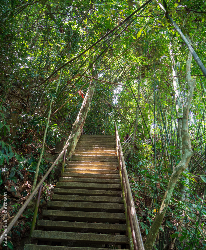 landscape front view nature trail in the forest with the abundance of trees At Khao Yai National Park, Thailand, is a steep wooden staircase leading walkeway up to the Haew Narok Waterfall.