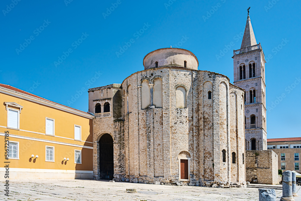 Church of St Donat with the belltower of Zadar Cathedral on May 22, 2022 in Zadar, Croatia.Church of St Donat with the belltower of Zadar Cathedral on May 22, 2022, in Zadar, Croatia.