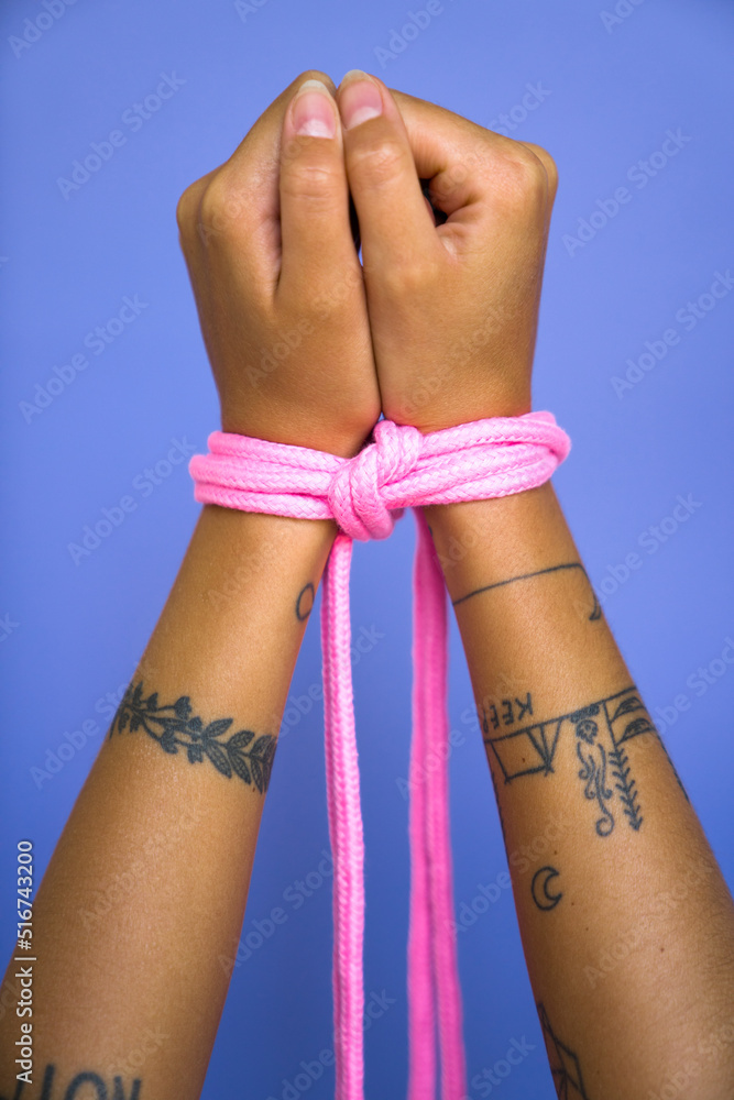 Unrecognizable female hands tied with rope posing over violet studio wall
