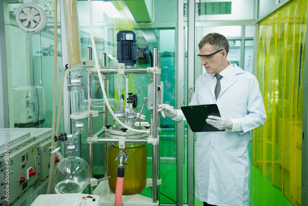 Caucasian male scientist with lab coat, gloves and glasses is monitoring pressure and temperature in process of CBD oil extraction from cannabis. Shot of Expert researcher checking marijuana examine.