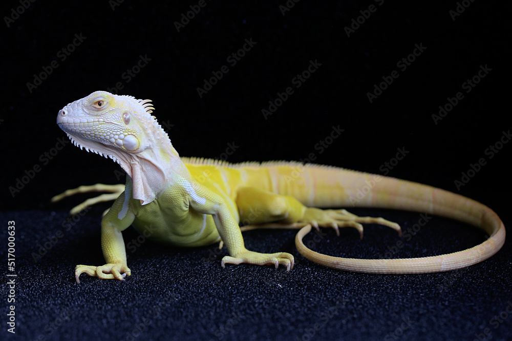 A yellow iguana (Iguana iguana) with an elegant pose. Selective focus on black background.
