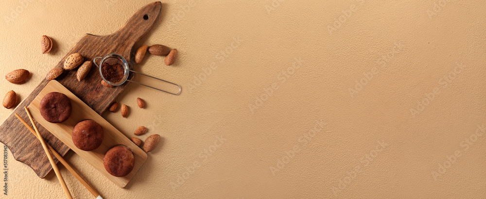 Composition with tasty mochi and almonds on beige background with space for text