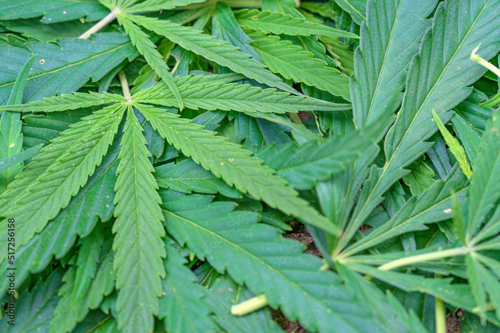 Large leaves and buds of cannabis. Hemp bush and empty space for text