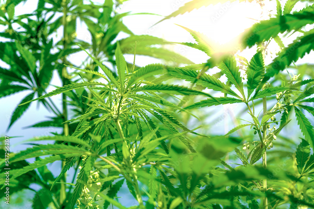 Large leaves and buds of cannabis. Hemp bush and empty space for text