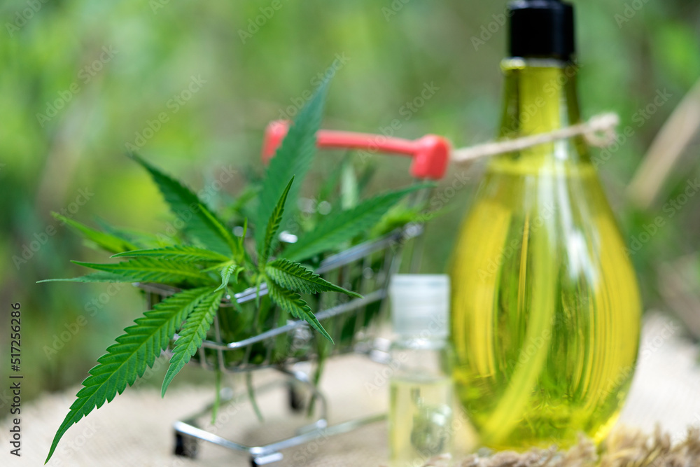 Hemp oil with hemp leaves. Top view of medical marijuana buds and hemp oil bottle