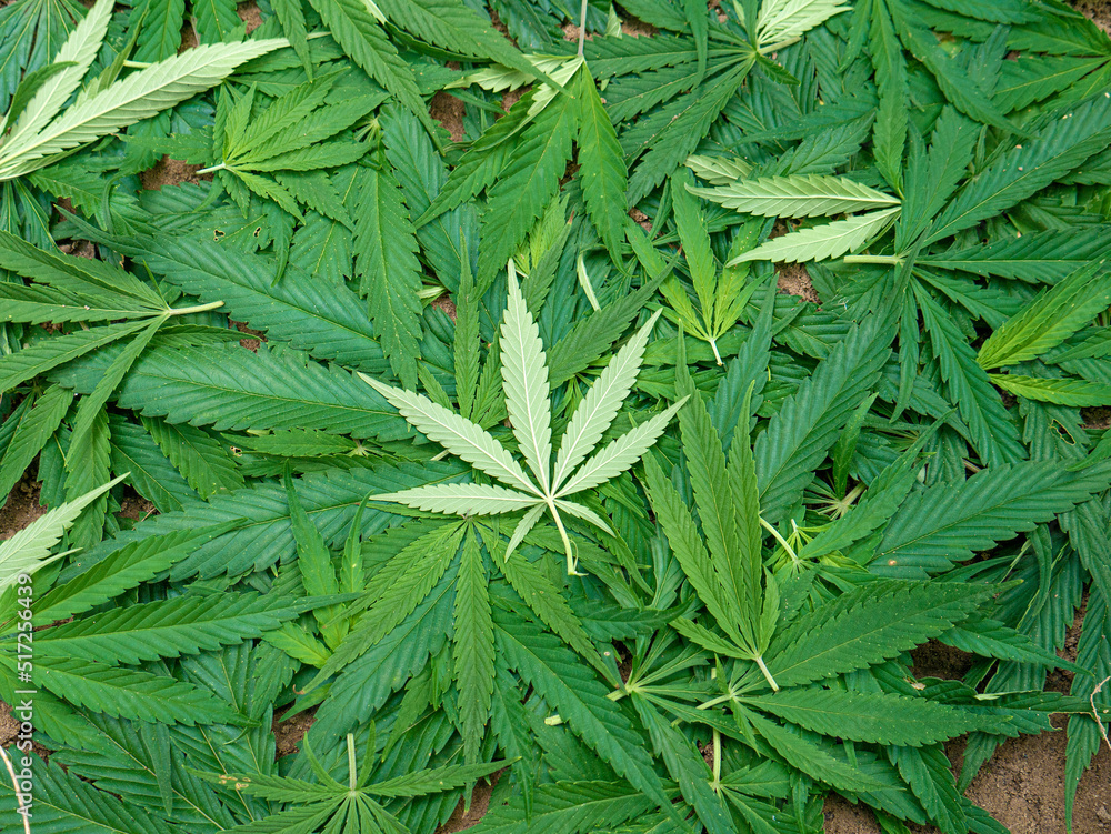 Large leaves and buds of cannabis. Hemp bush and empty space for text