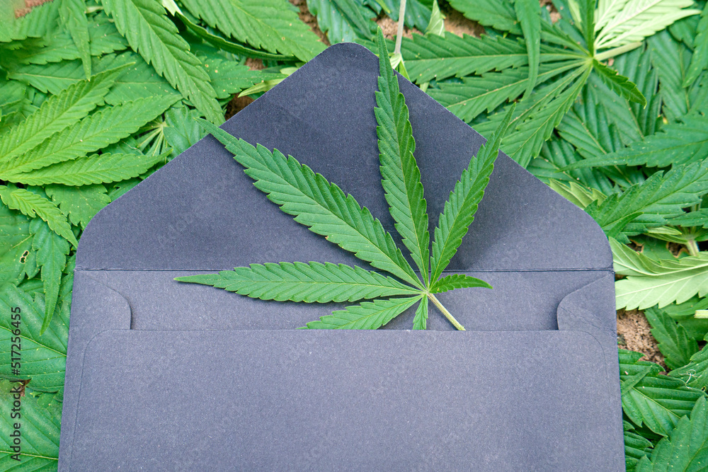 Large leaves and buds of cannabis. Hemp bush and empty space for text