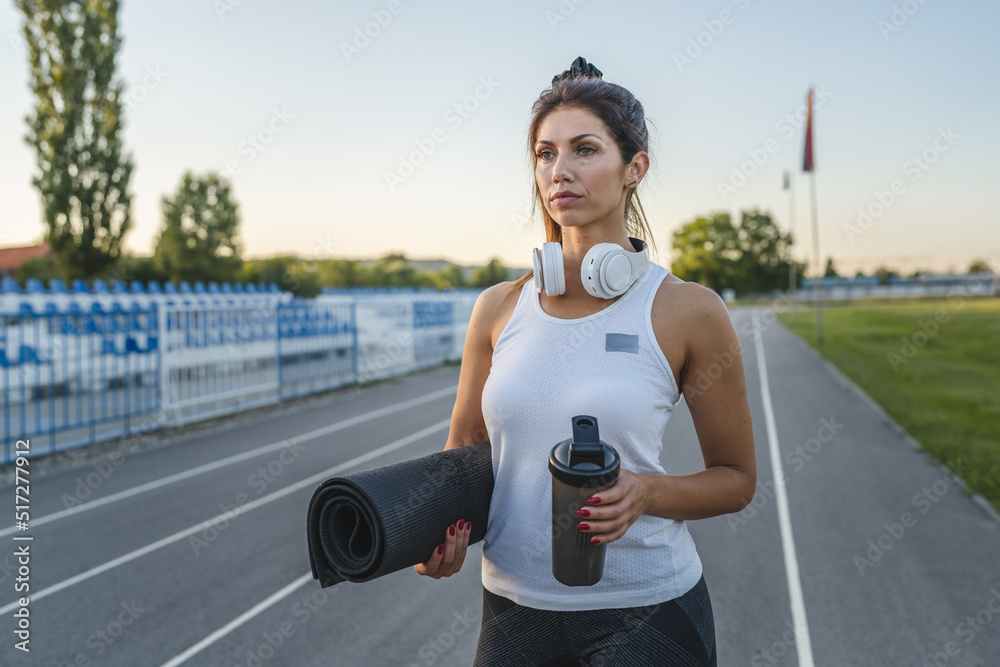 one woman adult caucasian female athlete standing on stadium on running track with supplement shaker and yoga mat with headphones ready for training outdoor in summer evening real people copy space