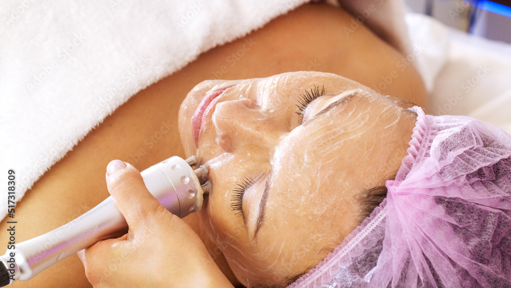 Woman in a spa salon on cosmetic procedures for facial care. Beautician makes medical procedures using a medical equipment. Cosmetologist making a woman a therapeutic procedure on a face.