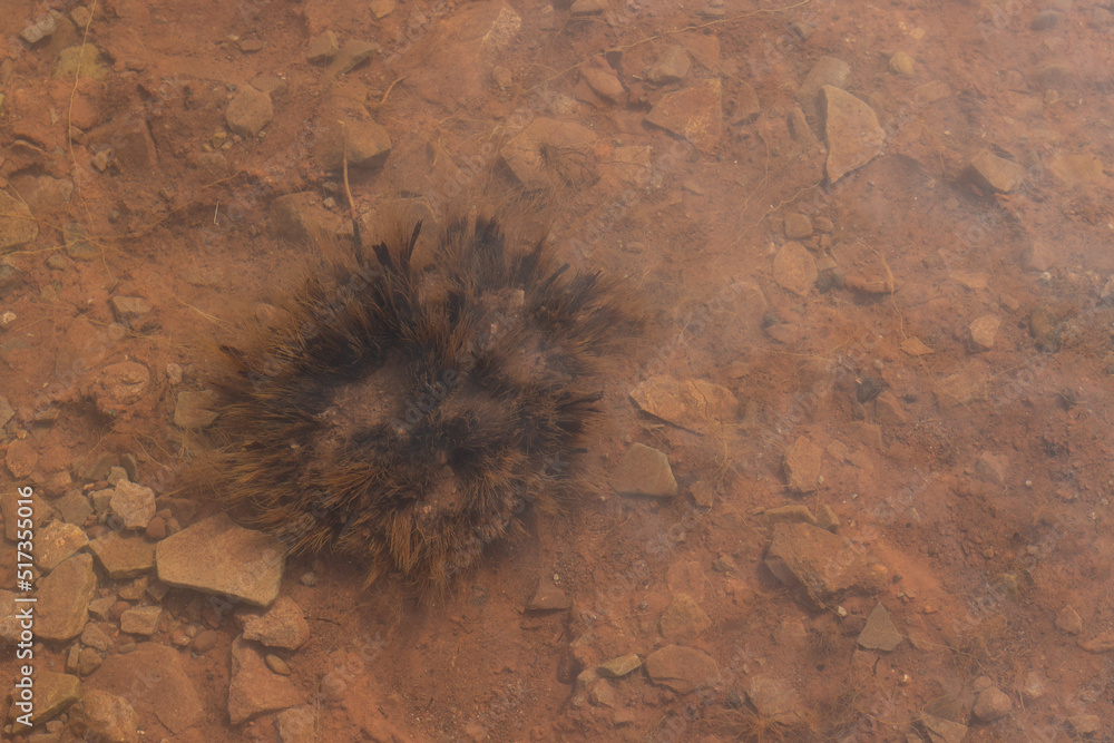 Red soil bottom of the lake with stones and a former grass bush under water. Natural background with copy space