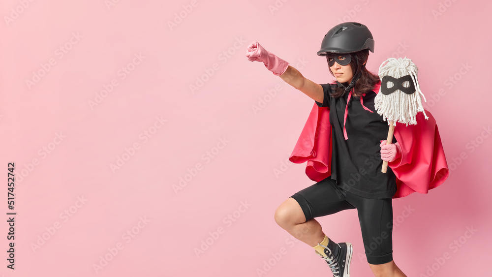 Self confident powerful superhero makes flying gesture clenches fist holds mop going to save you and help with cleaning dressed in costume isolated over pink background empty space on left side