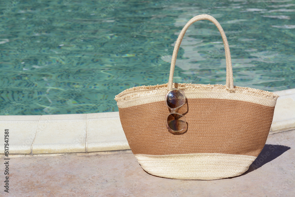 Stylish bag and sunglasses near outdoor swimming pool on sunny day, space for text. Beach accessories