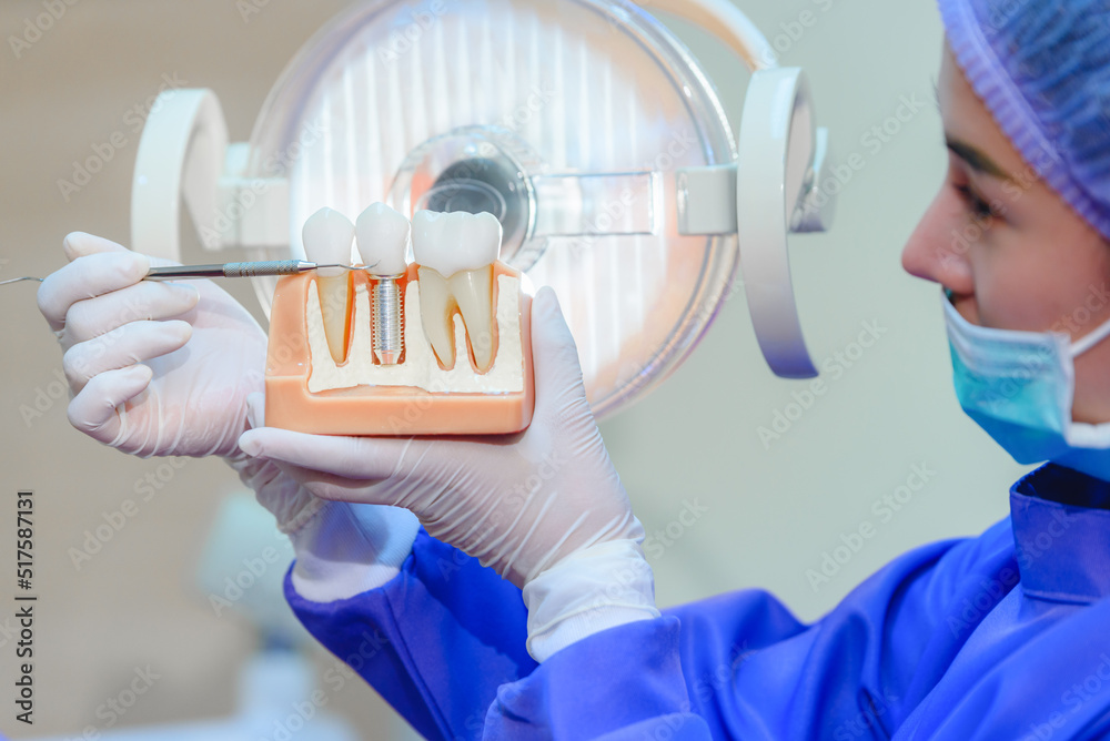 Dentist showing human teeth model and pointing to crown of Dental Implant. Knowledge about dental implants and caring for healthy teeth. Medical treatment at modern dental clinic or dentist office.