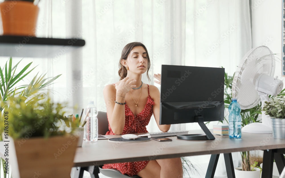 Woman cooling herself with an electric fan