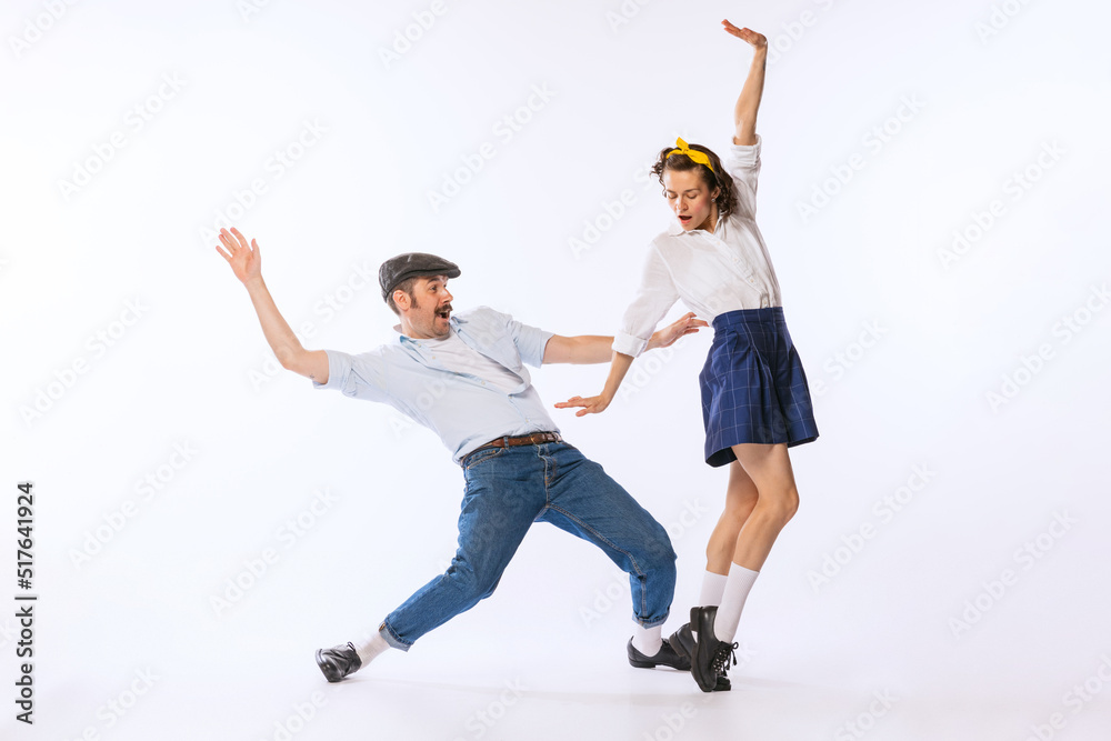 Portrait of young couple, man and woman, dancing isolated over white studio background. Retro style lovers