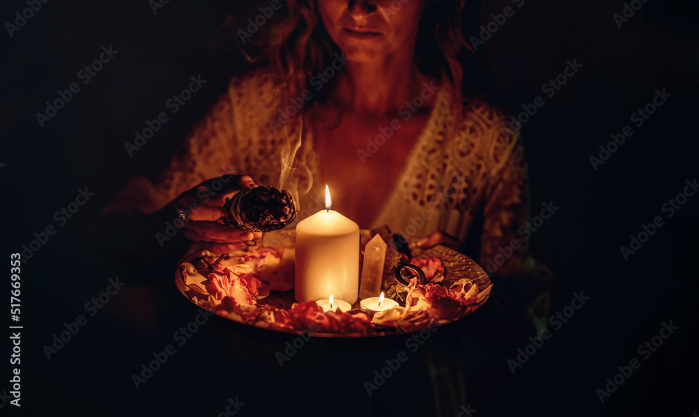 incense in a woman hand, incense smoke on a black background.