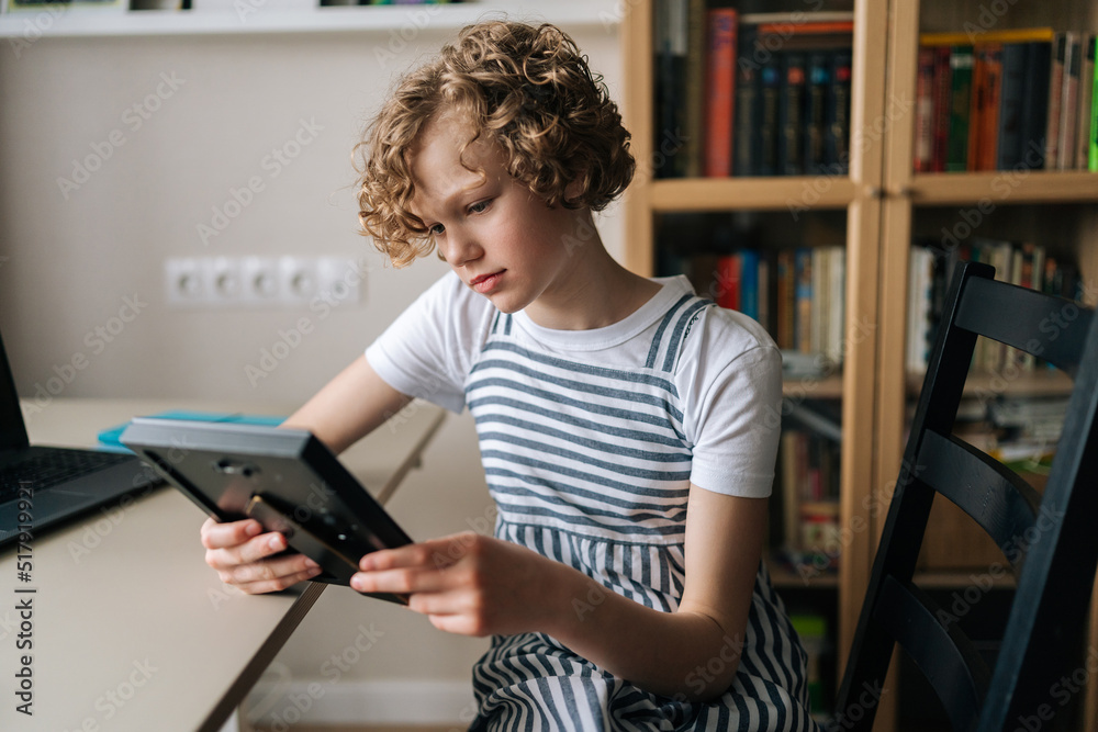 Depressed preteen girl holding photo frame in hands and looking with love at old family portrait. Frustrated adorable kid missed person in picture. Concept of nostalgia, grief, longing and loss