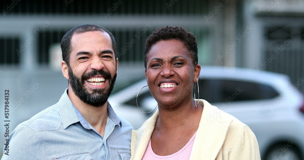 Married interracial couple laughing and smiling. African wife and hispanic mixed race husband. People real life laugh and smile