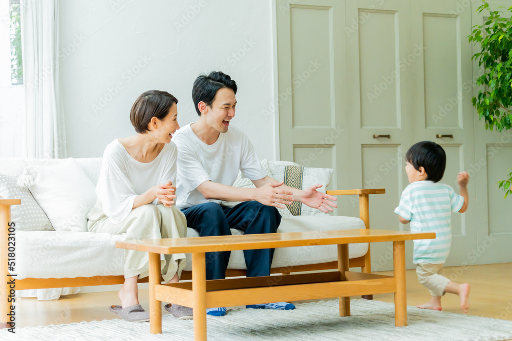 抱っこをする父親と見守る母親