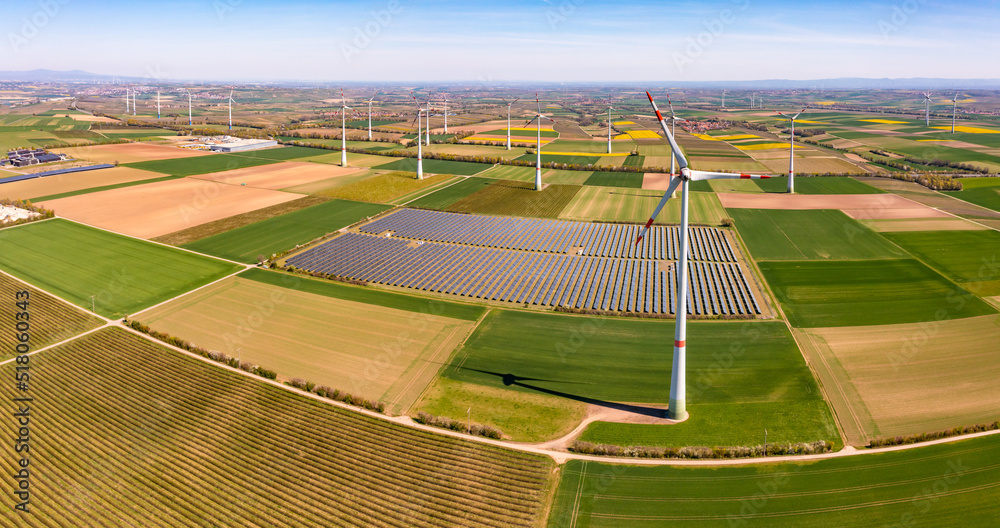 Luftbild-Panorama von Solarmodulen eines Solarparks inmitten von Windrädern zwischen landwirtschaftlichen Feldern
