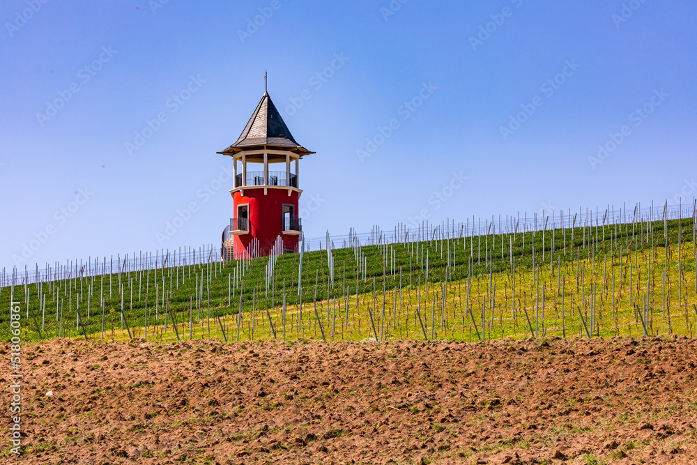 Am Burgunderturm bei Wörrstadt führen Wanderwege zwischen Weinbergen zum Aussichtspunkt