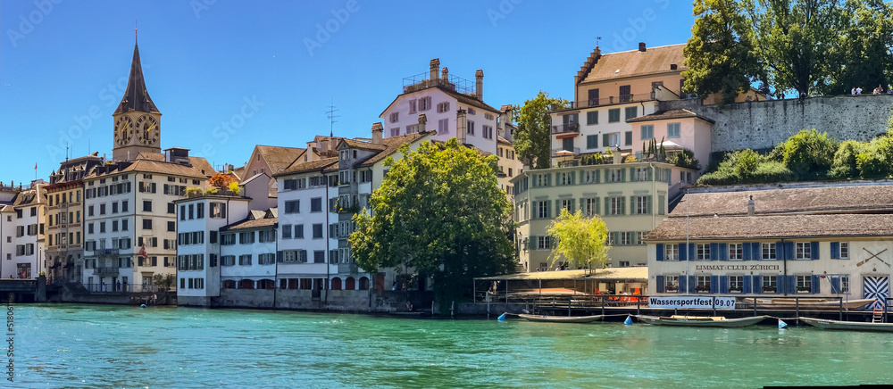 Malerischer Blick auf die Häuser an der Schipfe sowie die Kirche St. Peter am Limmat-Ufer in Zürich, Schweiz