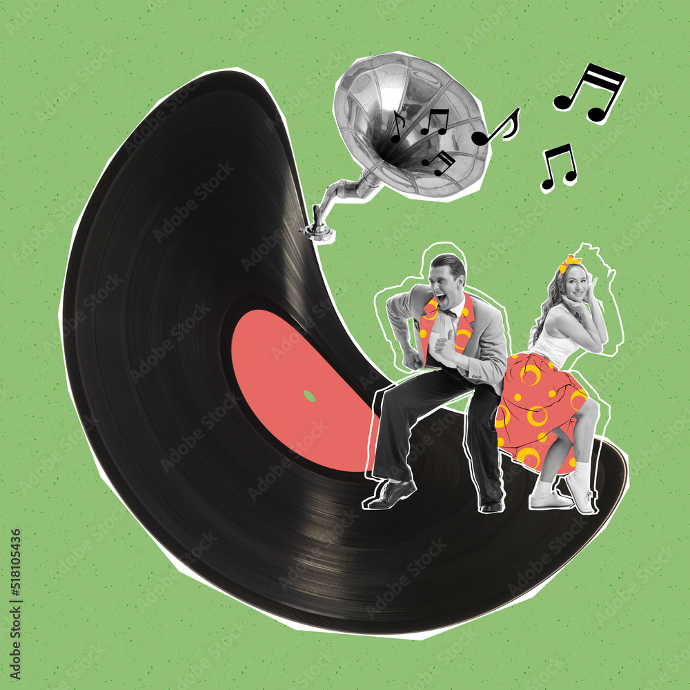 Contemporary art collage. Man and woman in vintage outfit dancing at giant vinyl record isolated on green background