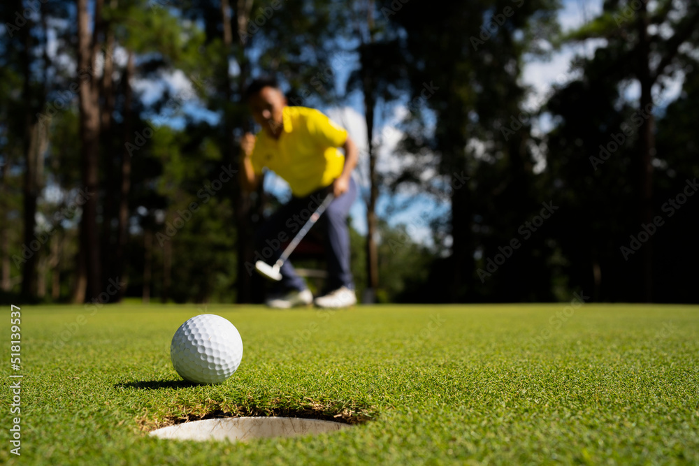 Golfer putting ball on the green golf, lens flare on sun set evening time.