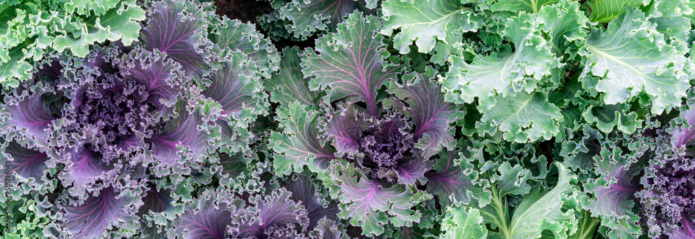 Green leaves of cabbage close-up. Cabbage seedlings planted close to each other.