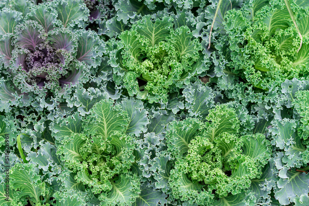 Green leaves of cabbage close-up. Cabbage seedlings planted close to each other.