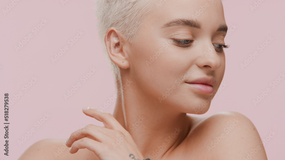 Gorgeous young slim fair-haired Caucasian woman looks away smiling on pale pink background | Skin protection concept