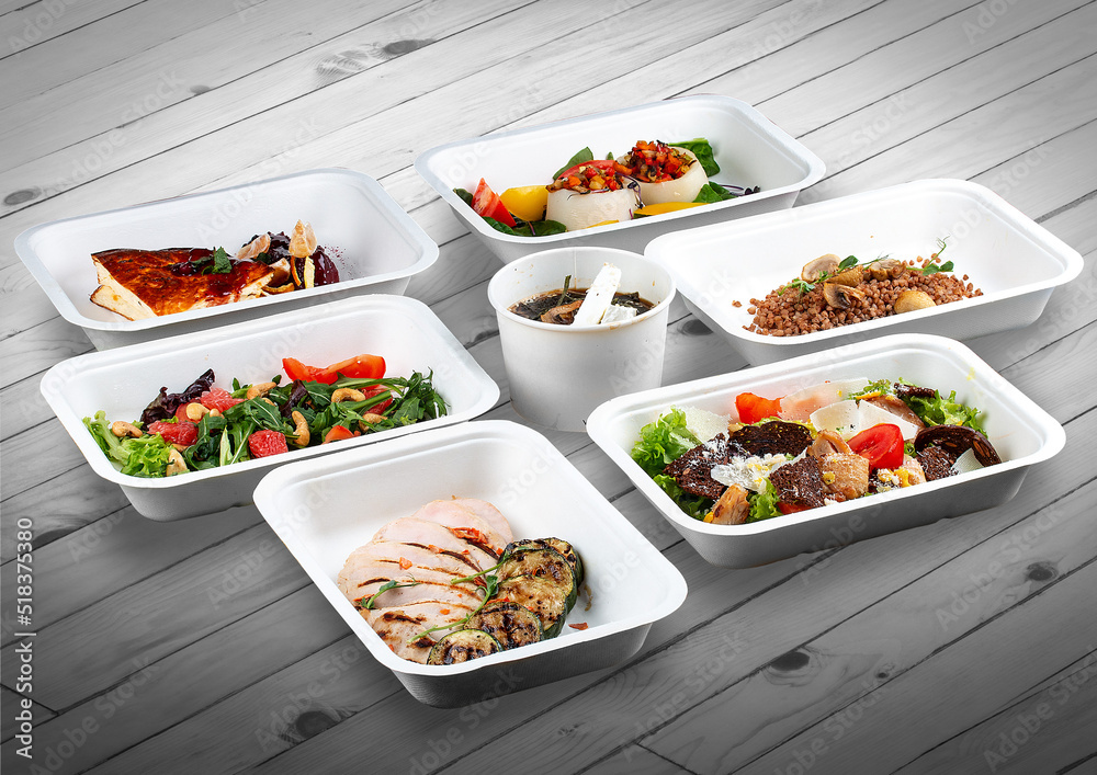 A set of healthy food dishes in ecological packaging on a wooden background. Food delivery. Takeaway.