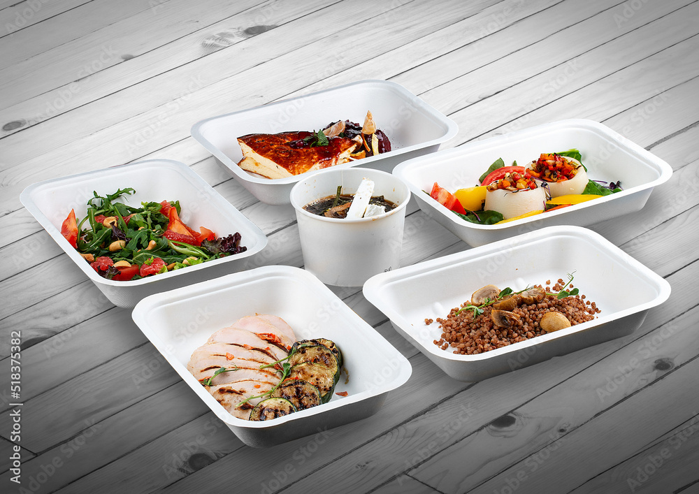 A set of healthy food dishes in ecological packaging on a wooden background. Food delivery. Takeaway.