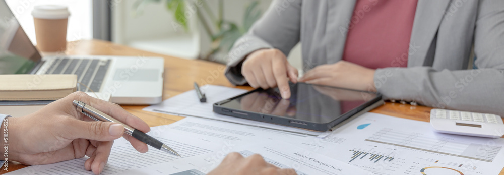 Brainstorm team, Marketers and financial accountants are discussing and analyzing charts to plan strategies to meet customer needs, Using graphs and tablet to analyze business data, Meeting concept.