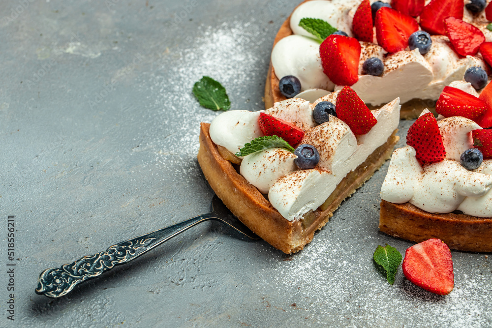 piece of tasty cake pie tart with fresh strawberries, raspberries, blueberry with shovel. Restaurant menu, dieting, cookbook recipe top view