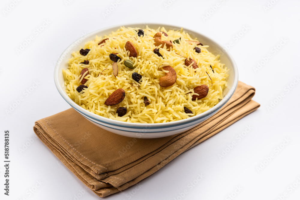 Kashmiri sweet modur pulao made of rice cooked with sugar, water flavored with Saffron and dry fruits