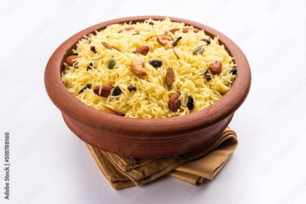 Kashmiri sweet modur pulao made of rice cooked with sugar, water flavored with Saffron and dry fruits