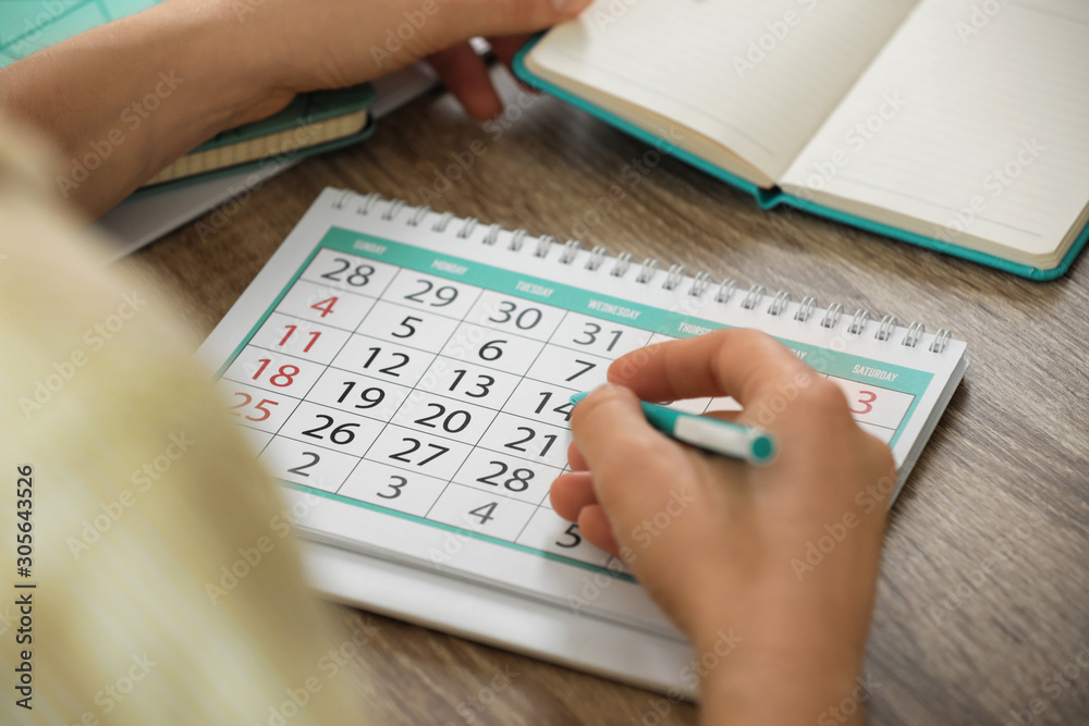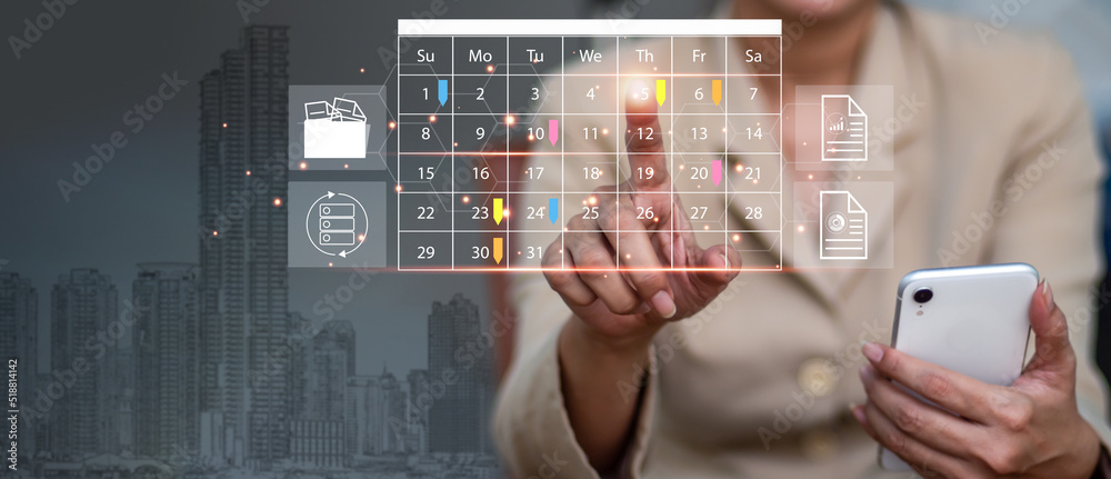 Reminder Appointment for the Calendar and the Organizer's Agenda Timetables and agendas used by event planners to organize and schedule activities. The woman on a phone, making notes on calendar app.
