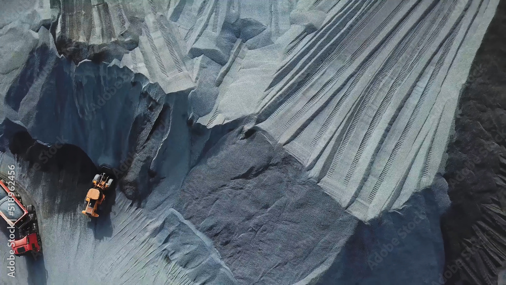 Aerial top view of quarry during work hours. Stock footage. Industrial background with sand quarry and many professional machinery tracks.