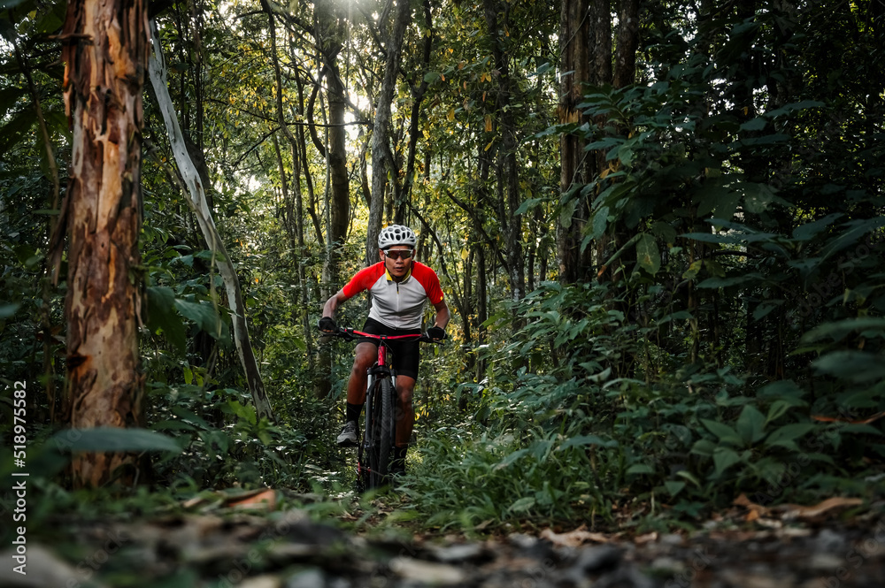 Mountain bikers ride MTB, mountain bike downhill to the extreme. Asian man rides MTB, mountain bike downhill in the wild to extremes. Extreme Sport and MTB, mountain bike downhill Concept.