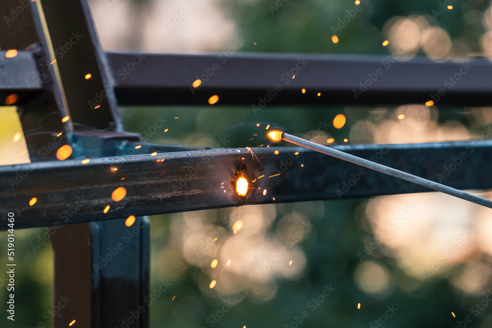 A bright flash of an electric arc between the electrode and the metal. arc welding