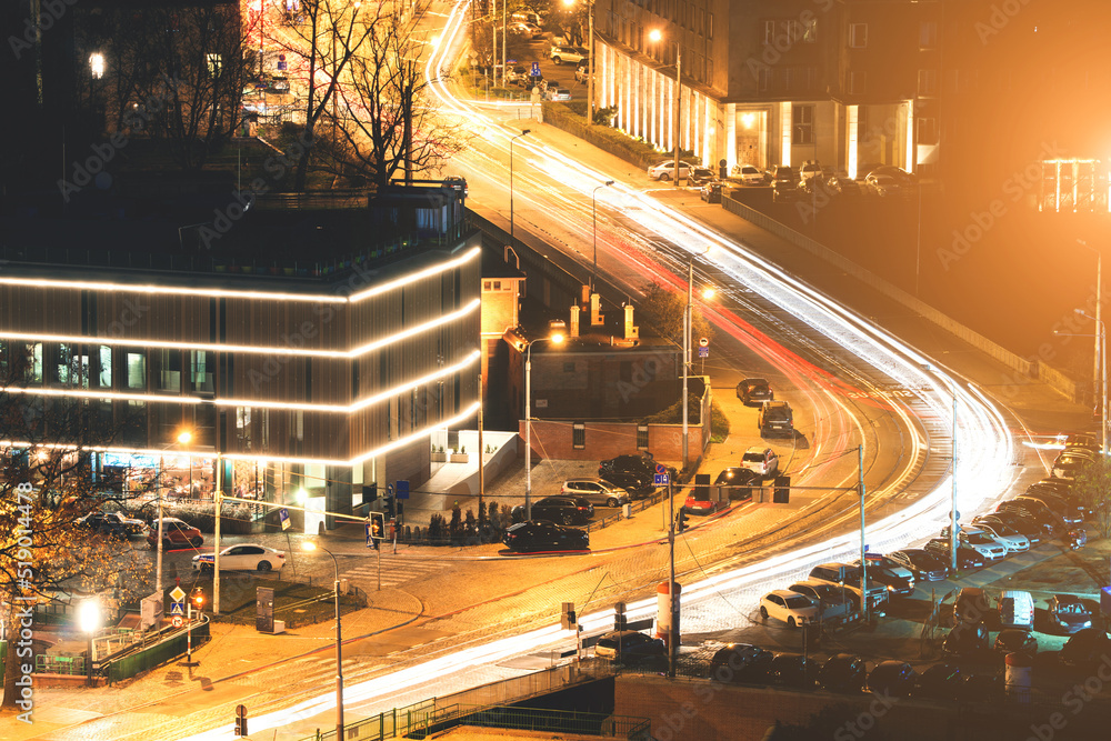 Abstract motion of winding city road with neon light motion effect. View from the top of the city street of the city of Wroclaw, Poland