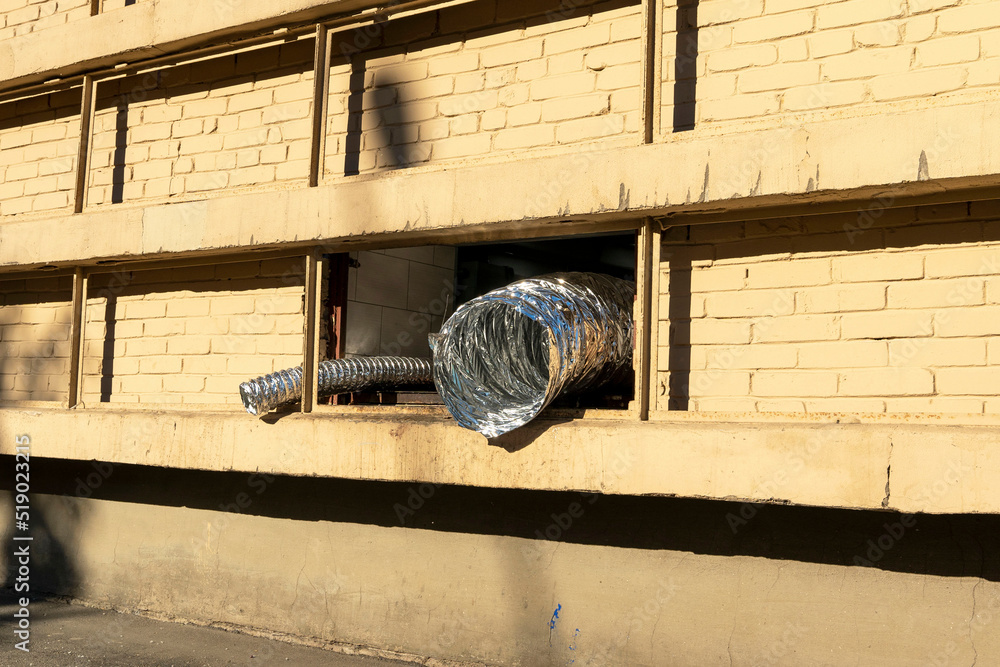Flexible aluminum foil duct at the window. corrugated exhaust hose