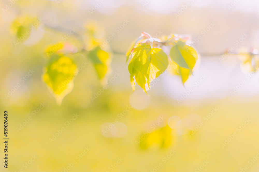 A branch with green leaves is illuminated by the sun . Spring. Young leaves. Natural background. Copy space.