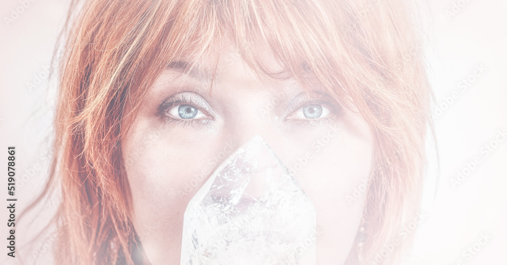Woman face and crystal on crystal background.