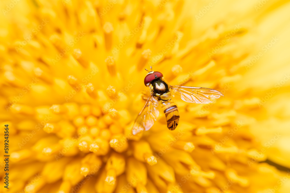 Hoverfly perched on yellow flower in the garden. Example of mimicry between insects.