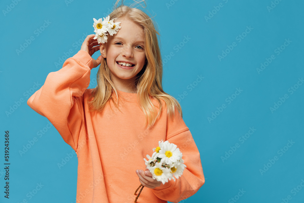 a beautiful, sweet little girl of school age stands on a blue background with a bouquet of daisies and with daisies in her hair, in her hands, in bright clothes. Horizontal studio photography