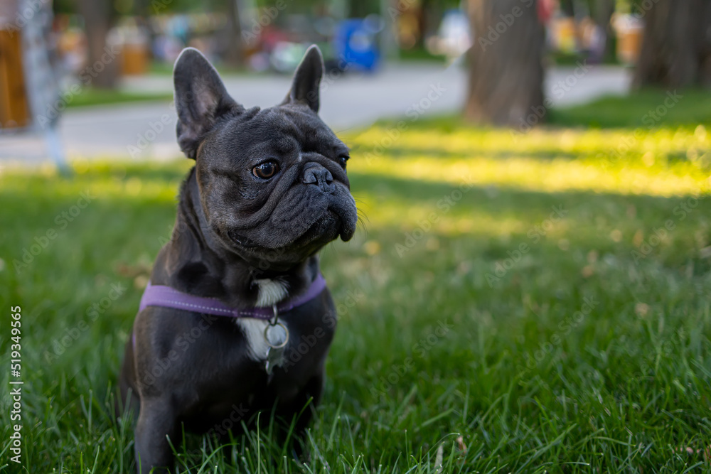 french bulldog stands on the lawn in the park and proudly looks ahead without looking away
