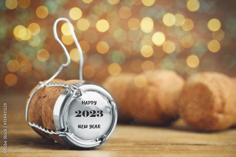 Cork of sparkling wine and muselet cap with engraving Happy 2023 New Year on wooden table against blurred festive lights, space for text. Bokeh effect