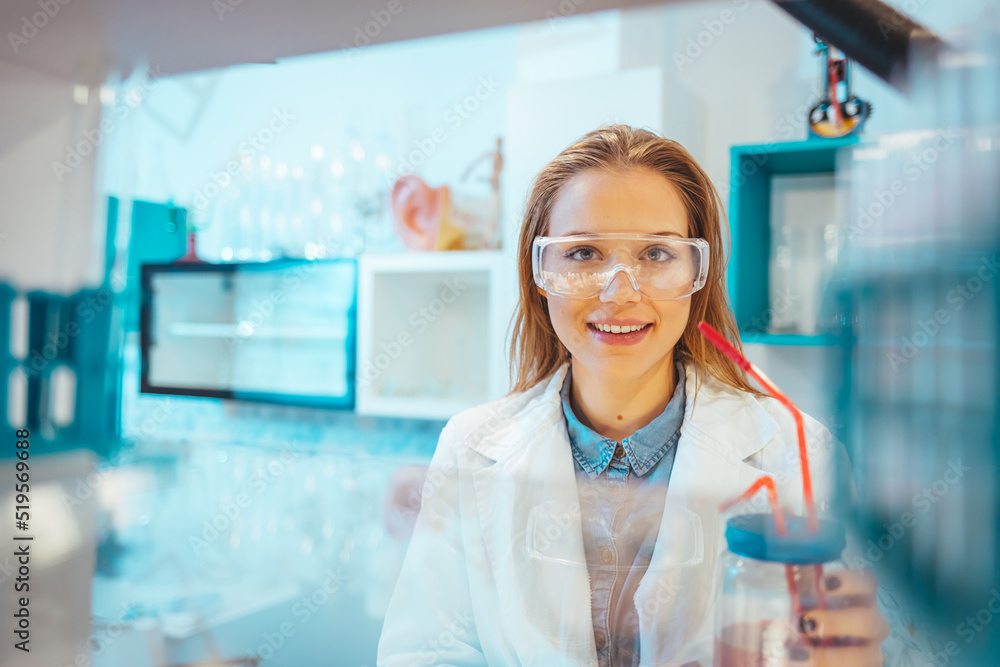 Close-up portrait of young scientist smiling. Confident female researcher is wearing protective eyewear. She is in science laboratory. State of the art science equipment.